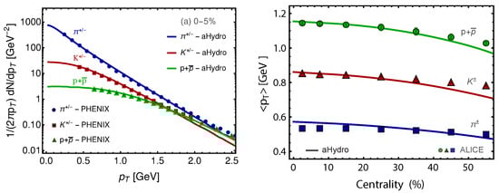 We first present comparisons of bulk observables between our model and experimental results. In Figure 2, (left panel), we show the spectra of pions, kaons, and protons as a function of the transverse momentum . The agreement shown between our model and the experimental results is good up to quite large GeV. In this figure, we show only one centrality class 0–5%, however one can see Ref. [82] for more comparisons up to 30–40% centrality class. It suffices here to say that the agreement is quite good up to GeV for high centrality classes. Next, we present the centrality dependence of the average transverse momentum of pions, kaons, and protons at 2.76 TeV in Pb-Pb collisions. Again, the agreement is very good up to high centrality classes ∼50%. The spectra at this energy is not presented here, however, it can be found in Ref. [64], where the agreement between aHydroQP model and the data for different centrality classes is good.