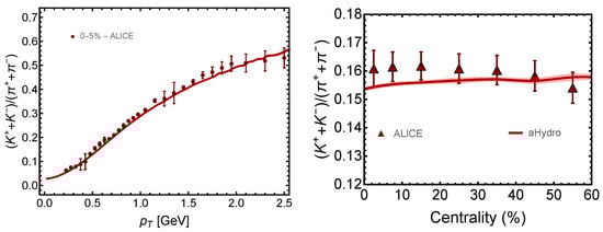 (Left) The kaon-to-pion yield ratio as a function of the transverse momentum. (Right) The centrality dependence of the kaon-to-pion yield ratio. In both panels, the predictions of aHydroQP model are compared to experimental data from the ALICE collaboration in Pb-Pb collisions at = 5.02 TeV [78,84].