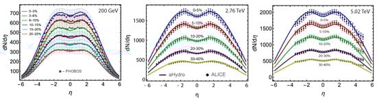 Charged particle multiplicity as a function of pseudorapidity. (Left), (Middle) and (Right) panels show results obtained at 200 GeV, 2.76 TeV, and 5.02 TeV collision energy in Refs. [64,78,82], respectively. The 200 GeV data are from the PHOBOS collaboration [85]. The 2.76 TeV and 5.02 TeV data are from the ALICE collaboration [86,87], respectively.