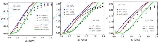 Furthermore, in Figure 5 we present comparisons of the anisotropic flow, in the 30–40% centrality class, where data are from the PHENIX and ALICE collaborations for Au+Au and Pb-Pb collisions, respectively. As can be seen from all three panels, our model shows reasonable agreement with data at low . A similar agreement between this model and experimental data is seen across different centrality classes, see Refs. [64,78,82].