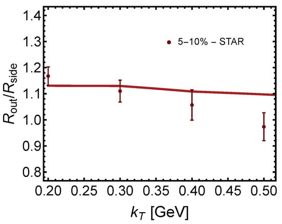 Finally, we present the aHydroQP predictions for HBT radii determined from pion correlations. As an example, in Figure 6, we show the ratio as a function of the mean transverse momentum of the pair in the 5–10 % centrality class. As can be seen from this figure, our model was able to describe the experimental data from the STAR collaboration quite well especially for low up to GeV. For more details, see [91]. We not here that a similar agreement of the HBT radii and thier ratios to the data is seen at 2.76 TeV for Pb-Pb collisions [64].