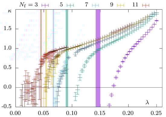 For Thirring models with even N f —these are equivalent to reducible models with N r = 1 2 N f —the situation is quite different. Figure 5 shows the curvature κ of the effective potential V at the origin in the different channels for 2 and 4 irreducible flavors. We see that for all λ λ * the curvatures are positive such that no condensate can form in the phase, which connects to continuum physics. This striking result will be further substantiated in the following sections.