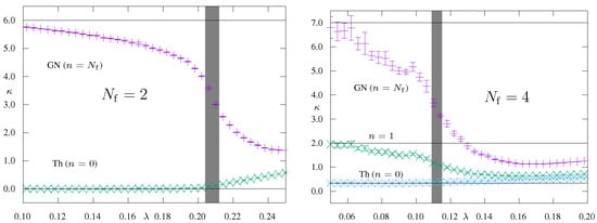 20. del Debbio, L.; Hands, S.J. The three-dimensional Thirring model for Nf = 4 and Nf = 6. Nucl. Phys. B 1999, 552, 339–362. [Google Scholar] [CrossRef][Green Version]