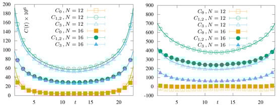 Figure 7. The correlation functions C 0 , C 1 , C 2 and C 3 of the interpolating operators for the low-lying mesons on lattice of various sizes. On the left for N r = 1 and on the right for N r = 0.8 [24].