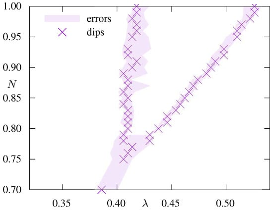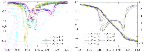 To extract a reliable estimate for N r crit we performed a detailed finite size analysis of the susceptibility, λ k in (49) on a grid of N r -values between 0.5 and 1.0 . The simulation results reveal two dips of the susceptibility for all N r 0.78 . Three examples are depicted in Figure 8, left panel. The dips become more pronounced with increasing system size, as seen in the same Figure on the right. The dip at stronger coupling belongs to the transition into the lattice artifact phase discussed above. More interestingly, we see a second dip at weaker coupling (larger λ ). Most likely, it points to a phase transition without order parameter.