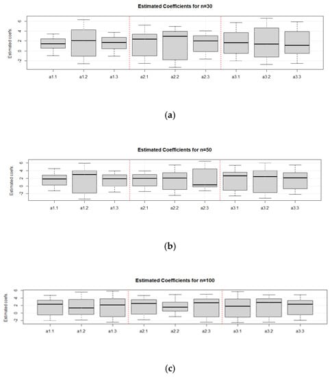 regression, while a3.1, a3.2, and a3.3 show the coefficients from the regression. (a). Boxplot of estimated regression coefficients for n = 30; (b). Boxplot of estimated regression coefficients for n = 50; (c). Boxplot of estimated regression coefficients for n = 100.