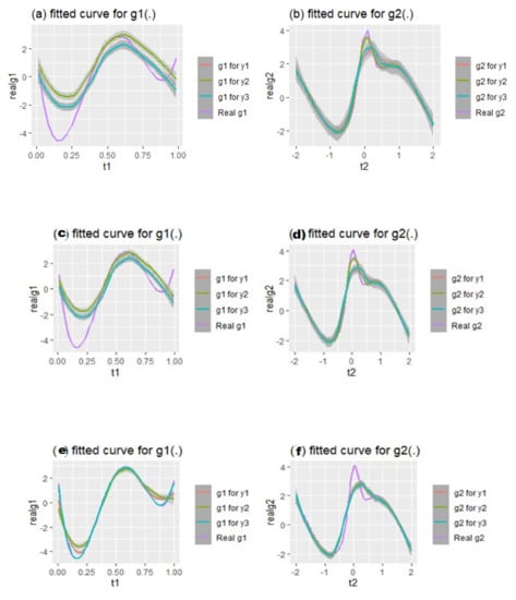 In this simulation we generated three samples sized . The response vector , consisting of three response variables and the design vector were produced from a uniform distribution. In addition, the MMSR model to be generated includes two different smooth functions, and with nonparametric covariates and , respectively. The number of replications for each sample used in simulation experiments were considered as 1000. Finally, the random error terms -s were independent and identically distributed from the multivariate normal distribution for three models.