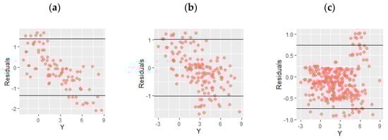 After the parametric and nonparametric components, Figure 3 is obtained to examine the overall residuals from the total MMSR model. It should also be noted that Figure 3 includes the scatter plots for residuals versus fitted values of the MMSR model for all sample sizes. Note that although there is some improvement in the performance of the model when n = 100, it is clear that the residuals are not randomly distributed around zero. The existence of a heteroscedasticity problem is debatable. However, it has also been observed that when the sample size is large, the residuals do not exceed the standard deviation limits.