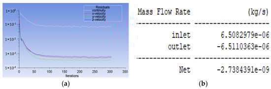 After calculate the flow field, the residual curve is shown in Figure 11a, and the model is iterated to about 75 steps, and the curve begins to oscillate. After 300 iterations, calculate and compare the inlet and outlet flow of the model. The result is shown in Figure 11b. The difference between the inlet and outlet flow rates is 2.738 × 10−6 kg/s, which only accounts for 0.042% of the inlet flow rate, so the calculation can be considered to have reached convergence. The cloud charts of pressure distribution of gas film are shown in Figure 11b.
