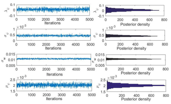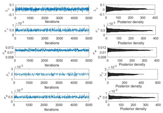 According to the parameters of the estimation method presented in Section 3, we obtained the Bayesian estimates of our models, as shown in Table 3, Figure 2 and Figure 3 are the posterior densities and iterations obtained via Gibbs sampling and the Metropolis–Hastings algorithm for each parameter.