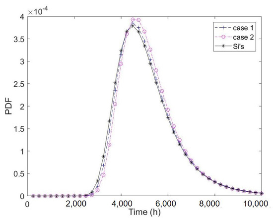 If the random behavior of is taken in to account, the unconditional PDF of T and the reliability function can be, respectively, derived using the law of total probability, as follows