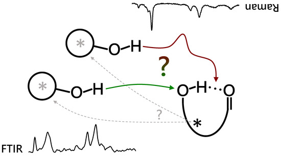 Different complexation options between an alcoholic OH and an internally OH:O=C hydrogen bonded ester, either inserting (red arrow, activation barrier) the alcohol into or attaching it (green arrow) onto the internal hydrogen bond. FTIR (lower left) and Raman (upper right, inverted) spectra are combined to elucidate the actual preferences under supersonic jet expansion conditions. The permanent (black *) and transient chirality (grey *) of the binding partners can potentially lead to chirality induction processes (dashed arrows).