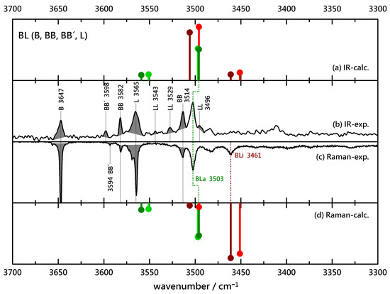 Based on previously published spectra of the homodimers BB, GG and LL [3,43] and the homodimer spectra of CC (Figure S4), as well as estimated relative abundances of these species based on computed intensities, the known contributions can be marked and allow to focus on the new, binary dimer signals. This is shown in Figure 2 for the (FT)IR and Raman (upside down) spectra obtained from relatively concentrated B/L coexpansions. Shaded monomer contributions match in terms of wavenumber in the IR and Raman traces, as do most homodimers, except for the metastable inversion-symmetric BB’, where the strong coupling between vibrations (accentuated by the rule of mutual exclusion) leads to displaced transitions. There is a single strong peak in both spectra at 3503 cm that must be due to a BL complex. If it were dominated by an insertion complex, there would be an even more intense, further downshifted Raman signal from the in-phase stretching motion of the two OH groups. However, there is only a less intense peak at 3461 cm that immediately tells that associated BL complexes dominate inserted complexes. This qualitative assignment can be further supported by harmonic wavenumber predictions for the most stable structures, which are uniformly scaled by 0.97 to best match the known homodimer signals. These suggest that the dominant BL peak in the IR spectrum could indeed have overlapping contributions from strongly IR-active OH stretching vibrations in hom and het variants of BLi and BLa, whereas the insertion/association-discriminating vibrations (upshifted for association, downshifted for insertion) are predicted and found to be too weak to be identified. The single, further downshifted Raman signal suggests that there is some insertion happening but clearly less than association. There is no evidence for a het/hom splitting (predicted to be small but detectable). This is all one can conclude from the BL spectra: more association than insertion, and no evidence for the presence of hom and het complexes at the same time.