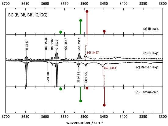 Comparison of experimental IR (upwards, (b)) and Raman (downwards, (c)) spectra of B(enzyl alcohol)-G(lycolate) coexpansions with He and simulated stick spectra (uppermost (a) and lowermost (d) trace, B3LYP-D3(BJ, abc)/def2-TZVP, double-harmonic approximation, wavenumber-scaled by 0.97, relative intensity based on IR band strength and Raman scattering cross section) of inserted (red) and associated (green) BG complexes. Shaded areas represent known contributions from homodimers BB (and isomeric BB’), GG and monomers B and G, as marked with their wavenumbers, leaving unshaded features as the best candidates for mixed complexes.