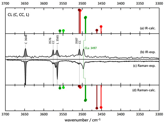 Comparison of experimental IR (upwards, (b)) and Raman (downwards, (c)) spectra of (4-)C(hlorobenzyl alcohol)-L(actate) coexpansions with He and simulated stick spectra (uppermost (a) and lowermost (d) trace, B3LYP-D3(BJ, abc)/def2-TZVP, double-harmonic approximation, wavenumber-scaled by 0.97, relative intensity based on IR band strength and Raman scattering cross section) of inserted (red) and associated (green) CL complexes (the darker color corresponds to the more stable isomer). Shaded areas represent known contributions from homodimer CC and monomers C and L, as marked with their wavenumbers, leaving unshaded features as the best candidates for mixed complexes.