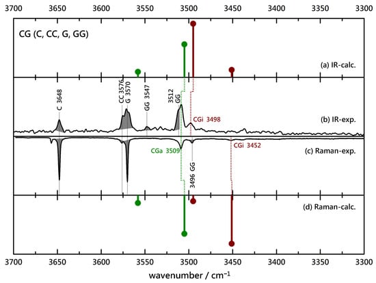 Comparison of experimental IR (upwards, (b)) and Raman (downwards, (c)) spectra of (4-)C(hlorobenzyl alcohol)-G(lycolate) coexpansions with He and simulated stick spectra (uppermost (a) and lowermost (d) trace, B3LYP-D3(BJ, abc)/def2-TZVP, double-harmonic approximation, wavenumber-scaled by 0.97, relative intensity based on IR band strength, and Raman scattering cross section) of inserted (red) and associated (green) CG complexes. Shaded areas represent known contributions from homodimers CC and GG and monomers C and G, as marked with their wavenumbers, leaving unshaded features as the best candidates for mixed complexes.