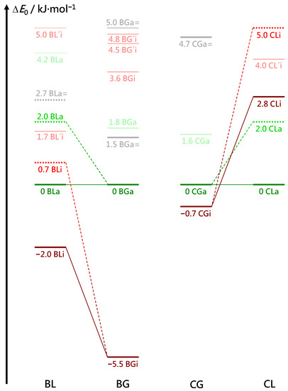 Vibrational zero point-corrected energy differences (B3LYP-D3(BJ, abc)/def2-TZVP) between different conformers for the four systems BL, BG, CG and CL. The most stable associated complexes are aligned at zero, and all conformers up to an energy difference of 5 kJ·mol−1 above that complex are shown. Red (green) colors indicate inserted (associated) structures. Complexes in which the alcohol is hydrogen-bonded to the carbonyl oxygen atom of the ester are marked in grey and labeled =. A prime indicates structures where the ester conformation or coordination deviates from the most stable structures. Solid lines are drawn for hom stuctures in which the (S)-(−)-lactate induces a gauche(−) conformation in the alcohol and dashed lines mark het complexes. The lines do not imply structural similarity but rather best-in-class property. The connecting line pattern thus emphasizes the systematic hom preference (chirality induction by L in B and C).