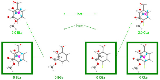 The most stable associated structures for the four systems BL, BG, CG and CL (all homochiral) and the most stable heterochiral complexes for the lactate cases. Structures observed in the experiment are framed. The chirality-generating methyl group is highlighted by different colors. The different hues of green for hom and het complexes match those in Figure 2, Figure 3, Figure 4 and Figure 5 and are chosen to emphasize that it is difficult to discriminate between them experimentally.