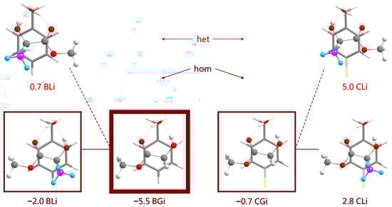 The most stable inserted structures for the four systems BL, BG, CG and CL (all homochiral) and the most stable heterochiral complexes for the lactate cases. The experimentally dominant inserted structure is framed as in Figure 7, whereas minor observed inserted contributions are marked by thinner frames. The different hues of red for hom and het complexes match those in Figure 2, Figure 3, Figure 4 and Figure 5 and are chosen to emphasize that it is difficult to discriminate between them experimentally.
