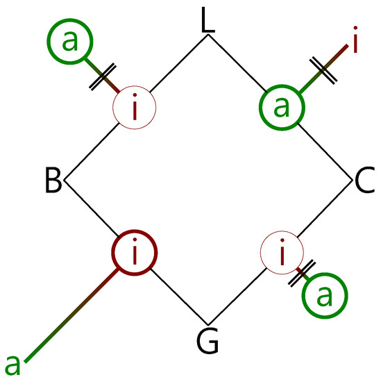 Schematic summary of the experimental findings for the combination of the alcohols B and C with the esters G and L, in terms of insertion (i) and association (a) complexes (circles). The predicted winning complexes are placed on the edges of the square, and the less stable topologies are placed away from the edges, with connecting lines qualitatively proportional in length to their predicted energy penalty. If the barrier exceeds 10 kJ·mol−1, the connecting lines are crossed (||). Observed structures are surrounded by thick circles if dominant and by thin circles if minor. The observations are consistent with insertion dominating for barriers less than 10 kJ·mol−1, if association is energetically disfavored.