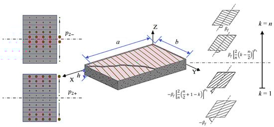 The configuration of the composite laminates embedded with anti-symmetric oblique coupling gradient SMA in Cartesian coordinates is shown in Figure 1. Here, a, b, and h are the length, width, and thickness of composite laminates, respectively. The X–Y plane of the coordinate system selected to be consistent with the midplane of composite laminates, while the Z coordinate measured from the mid-plane and positive upward. Substrate in laminates is comprised of graphite and epoxy resins according to the design proportioning. The embedded SMA wires are located antisymmetric obliquely with respect to the median plane (see the red wires in Figure 1), where denotes the angle between the orientation of SMA wires in layer n and the forward X-axis. Simultaneously, both orientation and volume fraction of SMA wires in composite laminates are arranged to vary continuously through the thickness direction according to the power law distribution, which displays a coupling gradient distribution.