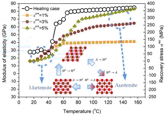 During the temperature rise, the phase transformation process makes the elastic modulus and recovery stress of SMA, as shown in Figure 2, and material properties of the SMA and matrix references [].