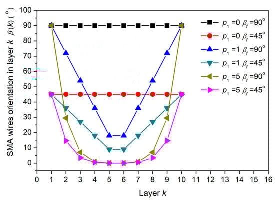 where and represent SMA wires orientation on the kth layer and gradient distribution parameter of SMA wires orientation, respectively.