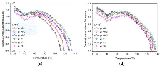 Temperature-dependent dimensionless natural frequency of different gradient distribution parameter of SMA wires orientation : (a) = 90; (b) = 75; (c) = 60; (d) = 45.