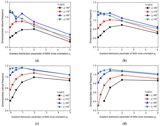 Variation of dimensionless natural frequency with gradient distribution parameter of SMA wires orientation at different temperatures: (a) = 25 °C; (b) = 45 °C; (c) = 65 °C; (d) = 85 °C.