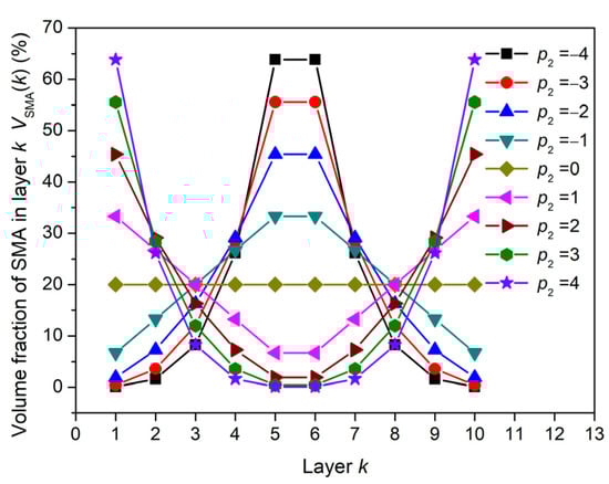 The influence of the gradient distribution of SMA wires volume fraction in the composite laminate on the natural frequency is examined with a certain total SMA content. In this section, is invoked as a gradient distribution parameter for the volume fraction of SMA wires. Figure 6 displays the gradient distribution of SMA wires volume fraction that is taken as −4, −3, −2, −1, 0, 1, 2, 3, and 4, respectively, where the gradient distribution of SMA wires volume fraction in each layer is achieved by Equations (2) and (3).