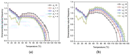 Figure 4a depicts the dimensionless natural frequency of composite laminates under different when = 90°. As the temperature rises, the natural frequencies corresponding to different change trends from basically similar to gradually separated. In the low-temperature range of 15 °C to 40 °C, the natural frequency decreases rapidly as the temperature increases. The decrease in the natural frequency is due to the increase in thermal stress caused by the large modulus of graphite, which plays a leading role in the stiffness of composite laminates. Simultaneously, the recovery stress generated by the SMA pre-strain induced at a temperature below 40 °C is generally less than 100 MPa, as shown in Figure 2, which has a weak influence on the stiffness of composite laminates []. Although the gradient distribution of the SMA wires orientation leads to differences in the recovery force of each layer, the overall recovery force of the composite laminates along the X-axis direction is still less, so the effect of pre-strain on the stiffness of the composite laminates can be ignored. As the temperature ranges from 40 °C to 75 °C, recovery stress induced by SMA pre-strain is higher than the thermal stress that is produced by graphite and epoxy. The recovery force in the composite laminates plays a dominant role in increasing the stiffness, thus increasing the natural frequency with increasing temperature. With the continuous increase in temperature, the recovery stress basically stabilizes, and the thermal stress plays a leading role again, resulting in the natural frequency of the composite laminates again being reduced until buckling occurs. In addition, Figure 4a shows that the gradient orientation of the SMA wires has a significant effect on the natural frequency of the mainly after the temperature is higher than 40 °C. The natural frequency increases with the increase in after the temperature rises to 65 °C, and the difference in the increase in the natural frequency is no longer obvious until is greater than 2. It is worth noting that the highest natural frequency corresponding to and the critical buckling temperature is positively correlated with .