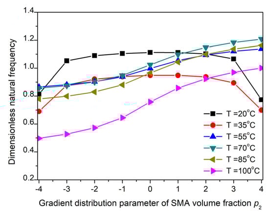 The gradient distribution of SMA wires volume fraction in composite laminates is classified as negative gradient distribution (), uniform distribution () and positive gradient distribution () according to classification. Figure 7a,b show the variation of dimensionless natural frequencies with temperature under 0 and 0 conditions. Figure 8 depicts the dimensionless natural frequencies of composite laminates with at temperatures of 20 °C, 35 °C, 55 °C, 70 °C, 85 °C, and 100 °C.