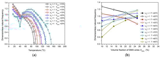 Figure 9a depicts the variation of dimensionless natural frequency with temperature as the volume fraction of SMA takes 10%, 15%, 20%, and 25% at = ±1. Figure 9b shows the variation of dimensionless natural frequency with the volume fraction of SMA corresponding to = ±1 at temperatures of 20 °C, 35 °C, 55 °C, 70 °C, 85 °C, and 100 °C. By means of Figure 9a,b, the dimensionless natural frequencies corresponding to = −1 and = +1 are close in the temperature range of 15 °C to 45 °C, and the volume fraction of SMA wires is negatively correlated with the natural frequency.