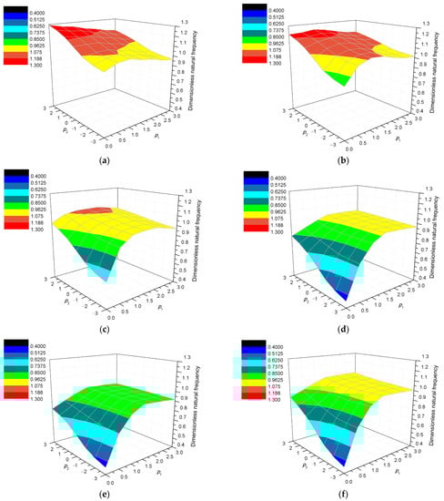 Dimensionless natural frequency distribution of coupling gradient coupling effect under different and conditions: (a) = 45, = 20%; (b) = 60, = 20%; (c) = 75, = 20%; (d) = 90, = 20%; (e) = 90, = 15%; (f) = 90, = 25%.