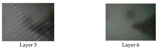 To verify the theoretical formula accuracy of this study, two composite laminate samples embedded with SMA wires were fabricated in this research. Composite laminates samples were fabricated in which SMA wires were embedded in two gradient distributions: symmetric orthogonal gradient distribution and anti-symmetric oblique gradient distribution. The sample matrices consisted of graphite and epoxy composite layers. SMA wires were assembled by hand lay-up between the layers. Subsequently, the contact interface was filled by a solution deployed by 325 mesh graphite powders and YDF-170 epoxy resin supplemented with 2-ethyl-4-methylimidazole curing agent at 6% mass ratio. The curing process of hardening the contact interface filling between layers required approximately 15 min with external heating at 60 °C. The length and width of composite laminates were 400 mm and 300 mm, respectively. Six layers were laid, each with a thickness of 2 mm. Table 2 and Table 3 show the laying parameters of symmetric orthogonal and antisymmetric oblique laying of SMA wires in composite laminates, respectively. The laying pattern of the SMA wires laying diagonally in each layer is shown in Figure 11.