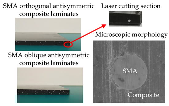 SMA symmetric orthogonal composite laminates and SMA anti-symmetric oblique composite laminates are given in Figure 12. Laser cutting and polishing the section of the intercepted end section of the composite laminate are performed. Surface morphology of laser cut section was observed by field radiation scanning electron microscope. The microscopic view of Figure 12 shows that SMA wires are relatively well connected to the substrate.