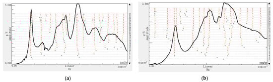 The modal test in this study adopts the Belgian LMS dynamic test system, which includes hardware such as SC316 data acquisition front-end, ICP accelerometer, multi-type hammer with ICP, and Test Lab software modules such as Impact Testing and Modal Analysis. Then the modal experiment was carried out by the hammering method. Figure 13a,b depict the steady-state diagrams of the frequency response of SMA symmetric orthogonal composite laminates and SMA anti-symmetric oblique composite laminates obtained through modal experiments, respectively.