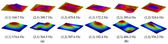 Theoretical modal calculations were performed on the experimental samples according to the actual material parameters to compare the theoretical and experimental results, thereby verifying the correctness of the theoretical methods. The results of experimental tests and theoretical calculations, including natural frequencies and modal shapes, are shown in Figure 14 and Table 4.