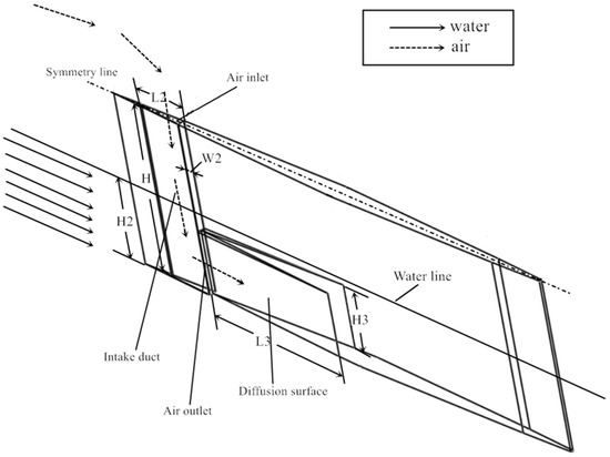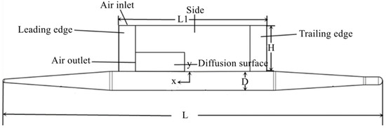 Figure 4 shows the layout of the strut in the proposed model. As can be seen from Figure 4, the proposed model consists of the strut and the submerged vehicle. A groove is designed in the underwater part of the rear side of the leading edge of the strut. The process of the strut’s automatic air intake is shown in Figure 1. When the vehicle moves, a low-pressure zone appears in the section with the groove, and the air outlet of the intake duct is placed in this low-pressure zone. The air inlet of the intake duct is designed on the top of the strut and connected to the external atmosphere. In this case, due to the Venturi effect, the external air is blended with the incoming flow through the air outlet of the intake duct. Moreover, the resultant air–water mixture propagates backwards along the diffusion surface, covering the underwater surface of the strut and having the effect of drag reduction by bubbly flows.