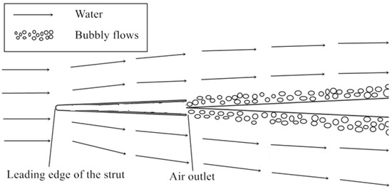 - As the sailing speed increases, the external air flows through the air outlet of the intake duct and it is blended with the incoming flow, forming bubbly flows on the surface of the strut and reducing the frictional drag of the strut.