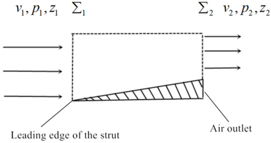 Figure 2 shows the planform of the strut’s automatic air intake. As can be seen from Figure 2, the bubbly flows form on the strut surface in the state of the strut’s automatic air intake when the vehicle is moving at high speed. Consider the portion from the leading edge to the air outlet of the strut as the control body, as shown in Figure 3. In the control body of Figure 3, water flows through the control plane and the control plane . The Bernoulli equation is established as follows: