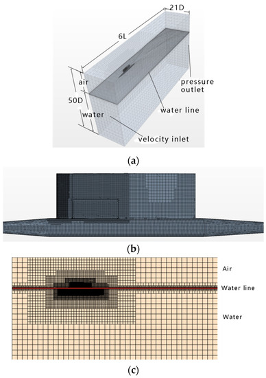 As part of the vehicle’s strut is above the water surface, the influence of the water surface cannot be ignored. An appropriate two-phase flow region is created in STAR-CCM+ based on the VOF model. The upper and lower halves of the velocity inlet are air and water, respectively. The inlet pressure and the outlet pressure vary in accordance with the water depth variation rule . A no-slip wall surface boundary condition is adopted for the wall of the vehicle. The grids on the wall surface of the vehicle are refined in Figure 5b, and mesh refinement is applied along the water-depth direction at the air–water multi-phase flow interface, as shown in Figure 5c.