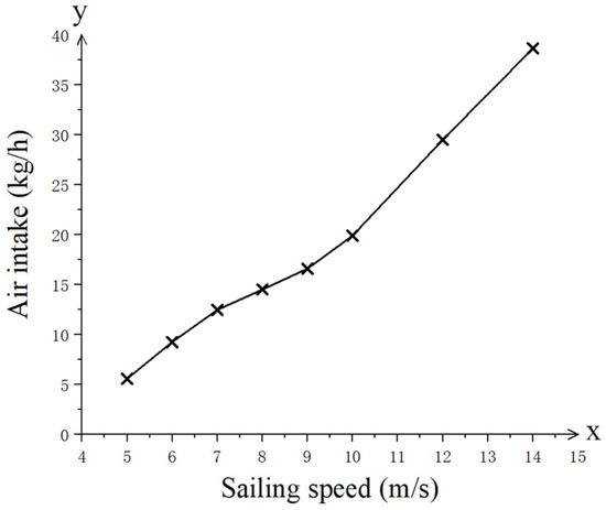 It is observed from Table 5 that when the sailing speed is 1–4 m/s the air inflow amount is 0. The reason for this is that at a lower sailing speed, the pressure difference between the outlet and the inlet of the duct induced by the Venturi effect is insufficient to overcome the hydrostatic pressure at the outlet as well as the pressure loss caused by the frictional drag when the air flows through the duct, with no air flowing out. However, when the sailing speed is above 4 m/s, the pressure difference between the outlet and the inlet of the duct can overcome the above-mentioned pressure loss. Therefore, the air starts flowing through the outlet of the duct. It should be indicated that higher sailing speed results in greater pressure difference and consequently more air inflow. Figure 6 illustrates the correlation between the air inflow amount and sailing speeds according to the data in Table 5. As can be seen from Figure 6, it is observed that the air inflow amount of the intake duct has a positive linear correlation with sailing speeds. Therefore, by adjusting the dimensions of the leading edge of the strut and appropriately designing the width of the intake duct, the optimal intake amount is obtained to realize the maximization of the strut drag reduction.