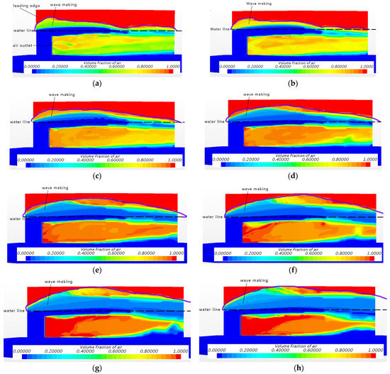 Meanwhile, Figure 7a–h show that as the sailing speed increases, the wave-making is extended. It should be indicated that the part between the red part and the waterline in Figure 7 is the wave-making. It is worth noting that at a lower sailing speed, the wave-making is small. In Figure 7a, the wave-making above the waterline has a relatively considerable distance from the top of the strut. Therefore, the wet area of the strut above the waterline is relatively limited. As the sailing speed increases, the wave-making continuously increases. When the sailing speed reaches 14 m/s, the wave-making is considerable, and the wave-making above the waterline in Figure 7h almost reaches the top of the strut so that the part of the strut above the waterline is mostly wet.