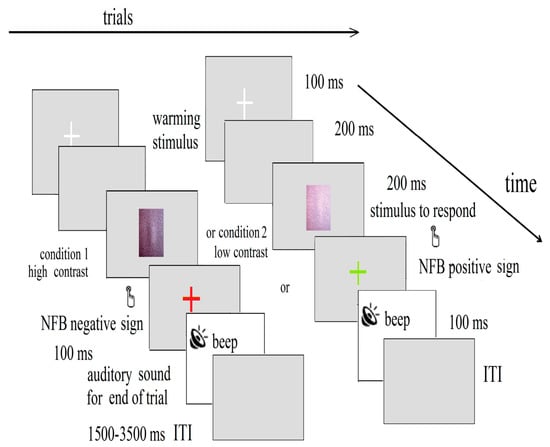 A subsequent fixation period of 100 ms of a color cross was presented on the screen, which changed to red/green when the selected EEG activity was below/above the set threshold, respectively. The child discriminated the low-contrast sinusoidal grating by pressing a button with the left hand, and discriminated the high-contrast sinusoidal grating by pressing a button with the right hand. A brief beep marked the trial’s end. A response-time period from 100 to 1500 ms began with the stimulus onset. The reaction times less than 0.100 s and more than 1.5 s were excluded as outliers. The correct answers and the reaction times were taken into account. The refresh rate of the computer screen was 60 Hz, with a pixel resolution of 1920 × 1080. The stimuli were generated with in-house software written on C++ [72], and they were synchronized with the EEG data acquisition system. The children received trial-by-trial neurofeedback in the form of different colored crosses.