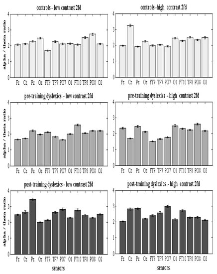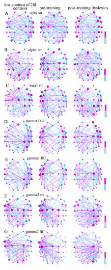The qEEG z-NF-VT intervention effects on the dysfunction of the dorsal route (prefrontal and premotor cortices, occipitoparietal gyri in α and θ networks) in developmental dyslexia, which is mainly in the left hemisphere, are more expressed in the high-contrast discrimination. This suggests the effect of the training on the reading skills achievement. Because of the anterior, superior, and middle temporal deficits affecting the primary ventral, the occipitotemporal route, the postD had improved ventral brain regions in the low-contrast LSF illusion, whereas they had improved dorsal (occipitoparietal) routes in the high-contrast LSF illusion. Figure A1 shows the changes in the interhemispheric α/θ differences between the pairs (Table A3). In the high-contrast condition, the qEEG z-NF reduces the α/θ scores for: the frontal regions (Fz); the right medial superior and middle temporal areas; the lateral occipitotemporal/posterior inferior temporal gyri, adjacent to the posterior fusiform/lingual gyrus, MST/MT+/V5/V4 (TP8); the middle occipital gyrus; the ventral visual cortices, V3v/V2 (PO8); and the associative visual V3 (O1-2) areas in the postD vs. the preD because of its suppression (Table A3) in the local hub θ network (Figure 3) and the changes in the global characteristics of the functional θ-frequency network of the postD (Table 3). In the low-contrast condition, the z-NF stimulated the increase in the α/θ values in all locations (Table A3), which induced the left-side hubs in the α-frequency network of the postD (Figure 2), and it changed the global characteristics of the functional α-frequency network (Table 2), which becomes more segregated and similar to that of the Con, compared to the more integrated network in the preD.