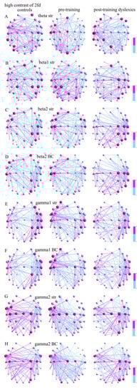 Compared to the Con, the postD had a statistically higher ΔL/lower ΔC in γ2, and a lower ΔL in the β1 network at a low contrast (ΔC: p = 9.4 × 10−6, χ2 = 19.63; ΔL: p = 4.0 × 10−7, χ2 = 25.69; Table 2), while, for the high contrast, a statistically higher ϕ and a lower ΔC were found in the γ1-frequency network (p < 0.001, χ2 > 10.41; Table 3).
