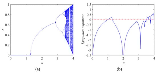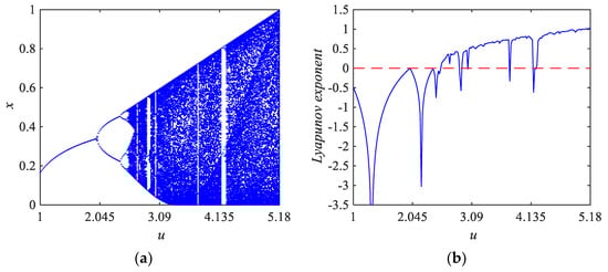 Bifurcation diagram and Lyapunov exponent of sine map system. (a) Bifurcation of system state versus parameter u; (b) the graph of Lyapunov exponent versus parameter u.