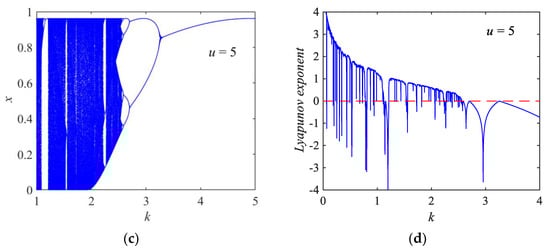 Bifurcation diagram and Lyapunov exponent of the PTM chaotic system. (a) Bifurcation of system state versus parameter u; (b) Lyapunov exponent curve with parameter u. (c) Bifurcation scene with parameter k; (d) the graph of Lyapunov exponent versus parameter k.