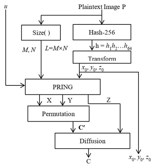 Our proposed encryption scheme can be divided into three main stages. In the first stage, SHA-2 256 hash algorithm was used to obtain the hash of plaintext image, and the encryption key was generated from it. In this paper, SHA-2 256 was chosen instead of SHA-1 or SHA-3, which is a compromise between security and computational complexity. The hash string was quartered, and the value of each part was mapped to a decimal greater than 0 and less than 1, and this decimal was taken as the initial state value of the chaotic PTM system. Then, the initial state values and the control parameter u of the PTM were used to generate pseudorandom numbers. In the second phase, row and column permutation was performed on the pixels of the picture by using pseudorandom numbers generated by the chaotic PTM system. In the third stage, a diffusion operation was applied to the permutated image and the final encrypted image was obtained. Figure 5 shows the flow block diagram of the proposed encryption procedure.